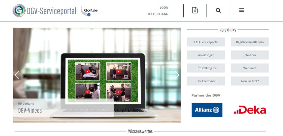 Mit dem neuen DGV-Serviceportal (www.golf.de/serviceportal) vereint der DGV drei bislang getrennte Onlinebereiche zu einer übersichtlichen und modernen Plattform für ehren- und hauptamtliche Mitarbeiter von Golfanlagen. Der zentrale Zugang zu allen Dienstleistungen, die der DGV seinen Mitgliedern anbietet – vom Intranet-Informationssystem bis zum umfangreichen Download-Angebot – vereinfacht die tägliche Arbeit der Funktionsträger in den Golfclubs.